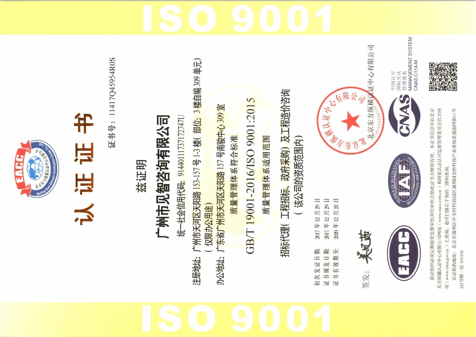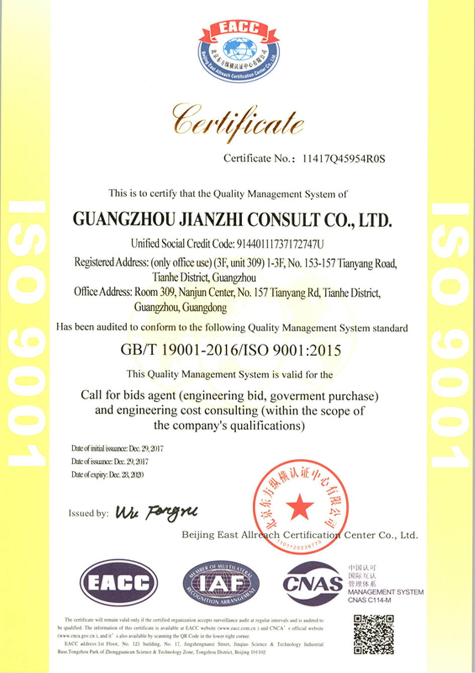 近日,廣州市見智咨詢有限公司順利通過(guò)質(zhì)量管理體系認(rèn)證審查,針對(duì)我司所從事的招標(biāo)代理(工程招標(biāo)、政府采購(gòu))及工程造價(jià)咨詢進(jìn)行了審核,在公司全體員工的共同努力下,我司以完善的管理體系和嚴(yán)謹(jǐn)?shù)姆?wù)措施順利通過(guò)了GB/T 19001-2016 /ISO 9001:2015質(zhì)量管理體系認(rèn)證,并榮獲EACC(北京東方縱橫認(rèn)證中心有限公司)頒發(fā)的證書。